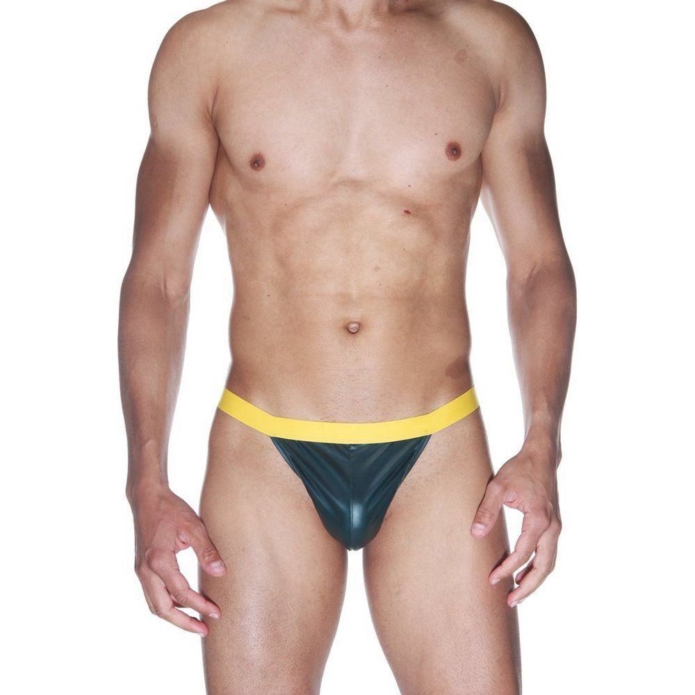Тонги для мужчин из гладкого блестящего материала. Трусы на широком желтом хорошо тянущемся поясе.
