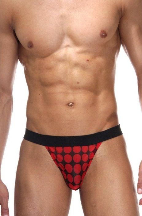Мужские трусы-тонги, на широкой черной резинке, выполнены из черной ткани в крупный красный горох.