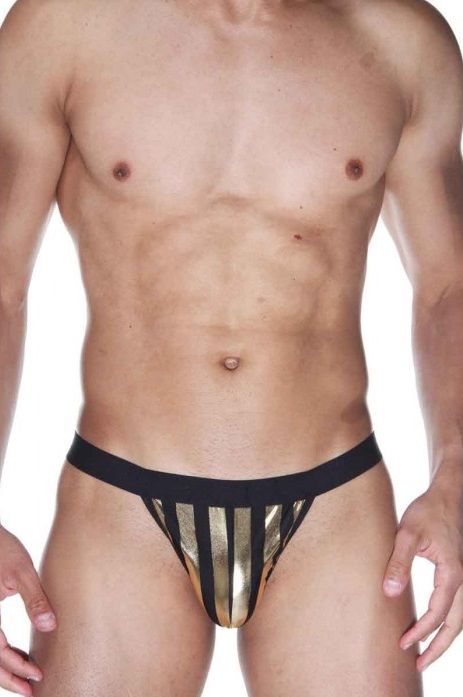 Мужские трусы-тонги из эластичной ткани в полоску.