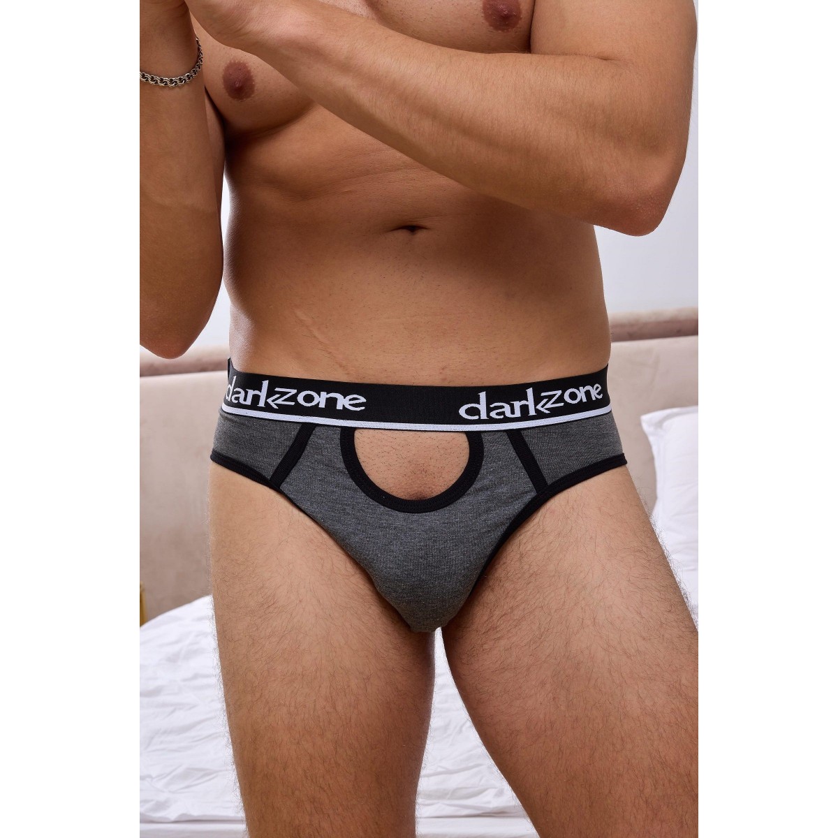 Темно-серые мужские трусы-брифы с вырезом.