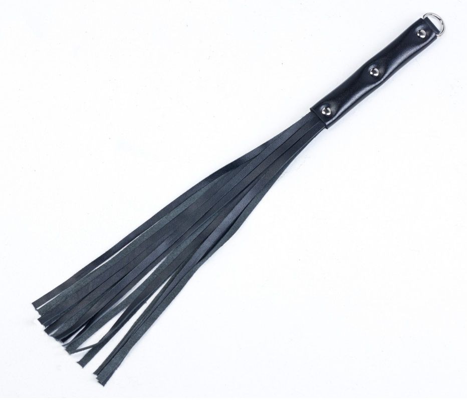 Кожаная плетка с 18 длинными хвостами. Особенности: - черная натуральная кожа (1,8-2 мм) - ручка из 6 слоев кожи, плотная и хорошо лежит в руке - 18 длинных хвостов, перекрученных у конца для большего эффекта - ширина - 2 см - полукольцо в ручке для подвешивания или петли - никелированная металлическая фурнитура