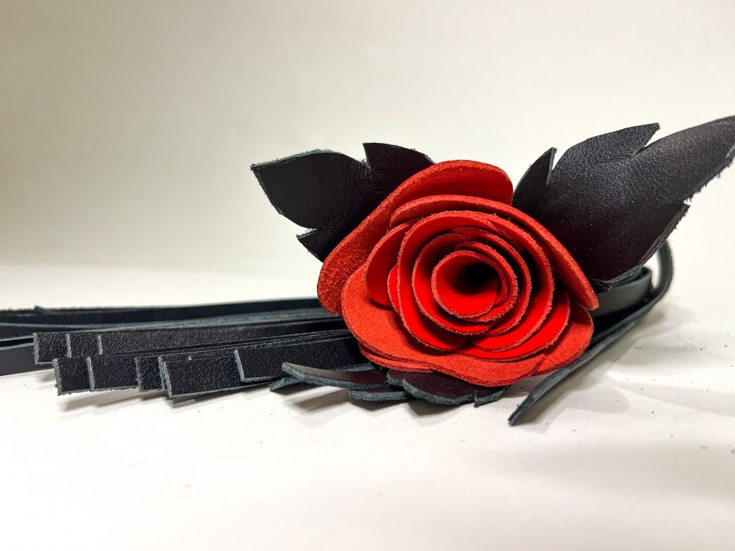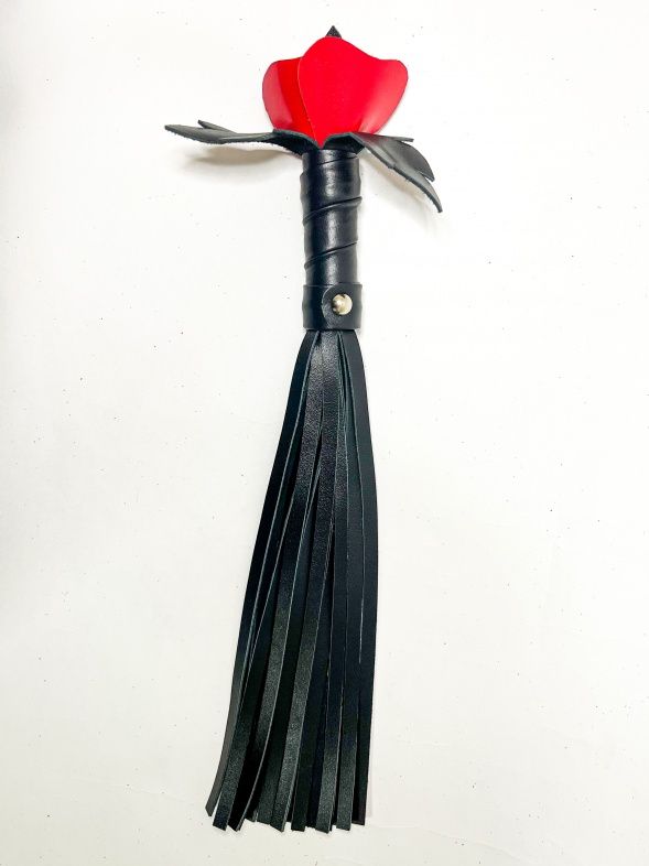 Восхитительная мини-плеть, украшенная красной розой. Цветок полностью выполнен из натуральной лаковой кожи, листочки розы, рукоятка и хвосты плети - натуральная мягкая кожа. Размеры этой плети очень изящны, поэтому данную плеть можно использовать, как генитальную, чтобы добавить новых ярких ощущений. Розочка очень удобно лежит в руке и создает неповторимую атмосферу и настроение, этот аксессуар никого не оставит равнодушным!