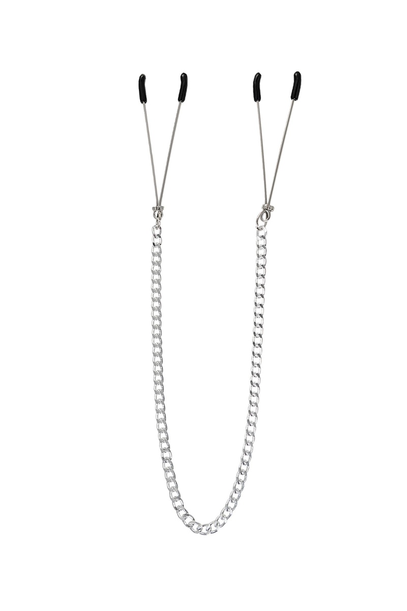 Аксессуар из премиальных материалов подарит непередаваемую, взрывную гамму чувств. Соприкосновение холодного металла с нежной кожей сосков будоражит сознание. Основная, стальная часть атрибута компактная, тактильно приятная и ее удобно держать в руке. На концах черные резиновые наконечники, для безопасного воздействия на эрогенные зоны. Силу сжатия легко регулировать с помощью мини колец. В зависимости от личных предпочтений и сценария игры, можно выбрать легкое пощипывание, или сильное сдавливание. Подходят как женщинам, так и мужчинам. Зажимы соединены крепкой цепочкой. При каждом ритмичном покачивании груди, цепочка эротично движется и игриво звенит. А если за нее нежно потянуть, то можно увеличить бурлящий коктейль чувств от стимуляции. Общая длина зажимов - 7см. Длина цепочки - 31 см.