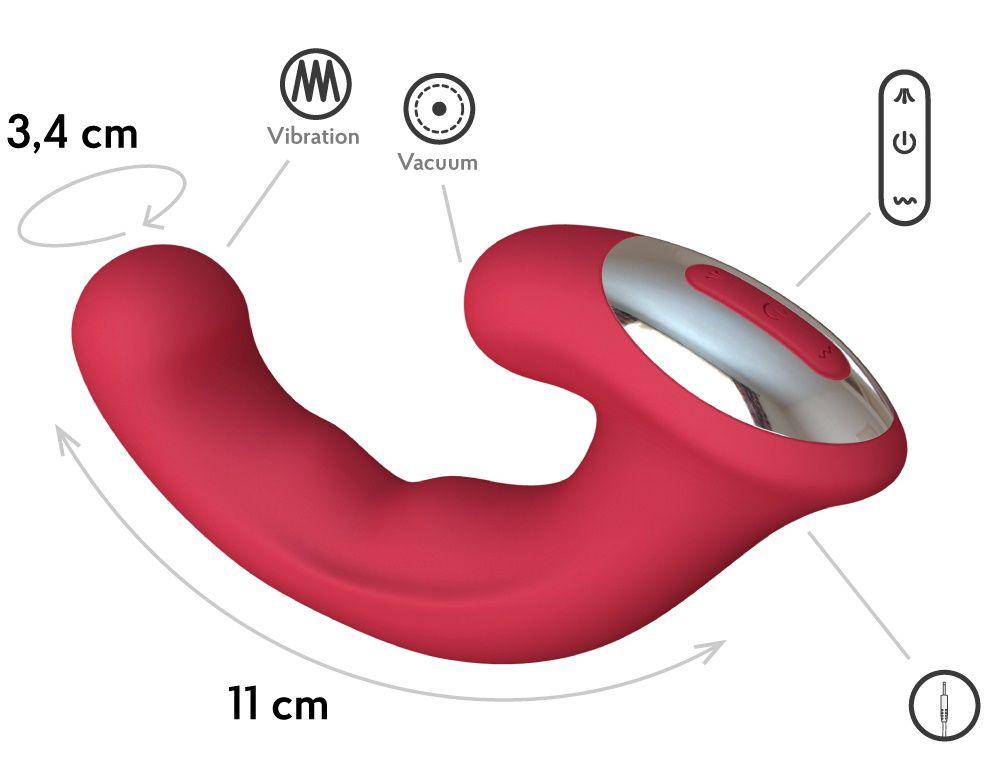 Роскошный вибратор Phoenix – это потрясающий своей функциональностью девайс! С ним каждый новый оргазм будет уникальным за счет большого разнообразия сочетаний 8-ми режимов глубокой вибрации и 10-ти уносящих в космос интенсивностей вакуумной стимуляции. Анатомический изгиб на конце вводимой части гарантирует плотное прилегание и феерические ощущения в области точки G, а регулируемая бесконтактная стимуляция клитора доведет Вас до пика двойного оргазма! Приятный на ощупь материал не вызывает аллергии и раздражения, а 1,5 часа работы без подзарядки гарантируют длительное наслаждение. DC зарядка и перезаряжаемый аккумулятор. Рабочая длина - 11 см. В комплекте: вибратор, USB-провод для зарядки, фирменный мешочек для хранения, инструкция.