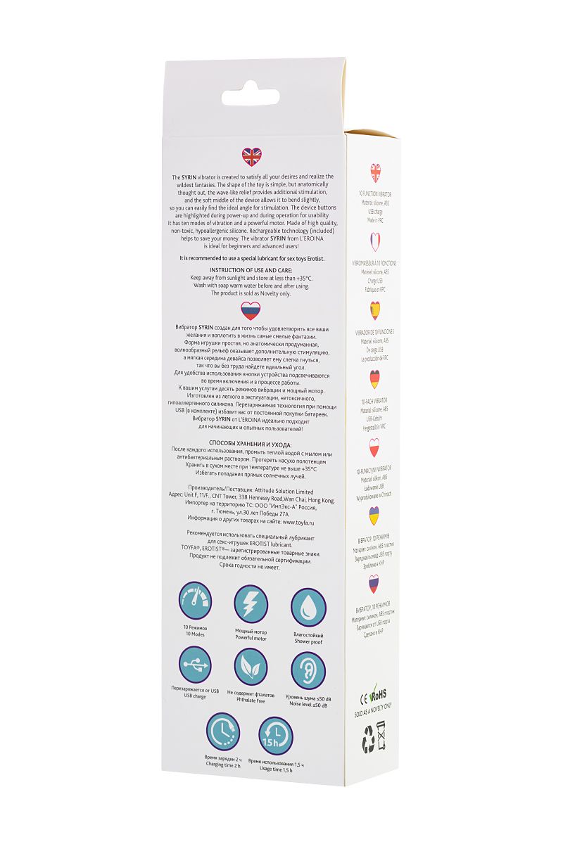Вибратор SYRIN создан для того чтобы удовлетворить все ваши желания и воплотить в жизнь самые смелые фантазии. Форма игрушки простая, но анатомически продуманная, волнообразный рельеф оказывает дополнительную стимуляцию, а мягкая середина девайса позволяет ему слегка гнутся, так что вы без труда найдете идеальный угол для стимуляции. Для удобства использования кнопки устройства подсвечиваются во время включения и в процессе работы. К вашим услугам десять режимов вибрации и мощный мотор. Изготовлен из легкого в эксплуатации, нетоксичного, гипоаллергенного силикона. Перезаряжаемая технология при помощи USB (в комплекте) избавит вас от постоянной покупки батареек. Вибратор SYRIN от L’EROINA идеально подходит для начинающих и опытных пользователей! Минимальный диаметр - 2,8 см.